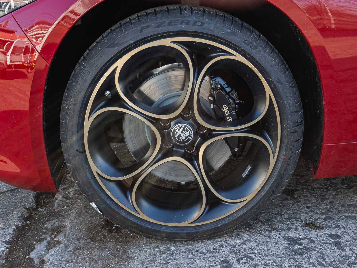 - BREMBO® Bremsanlage mit schwarz lackierte Bremssättel und goldfarbenen Alfa Romeo Schriftzug