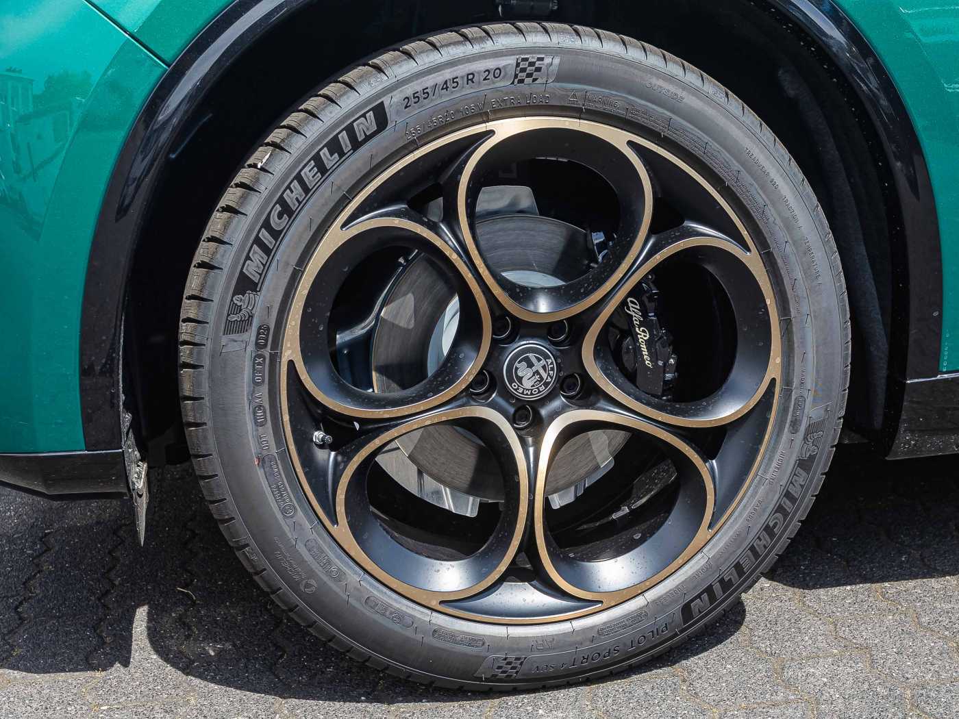 - BREMBO® Bremsanlage mit schwarz lackierte Bremssättel und goldfarbenen Alfa Romeo Schriftzug
