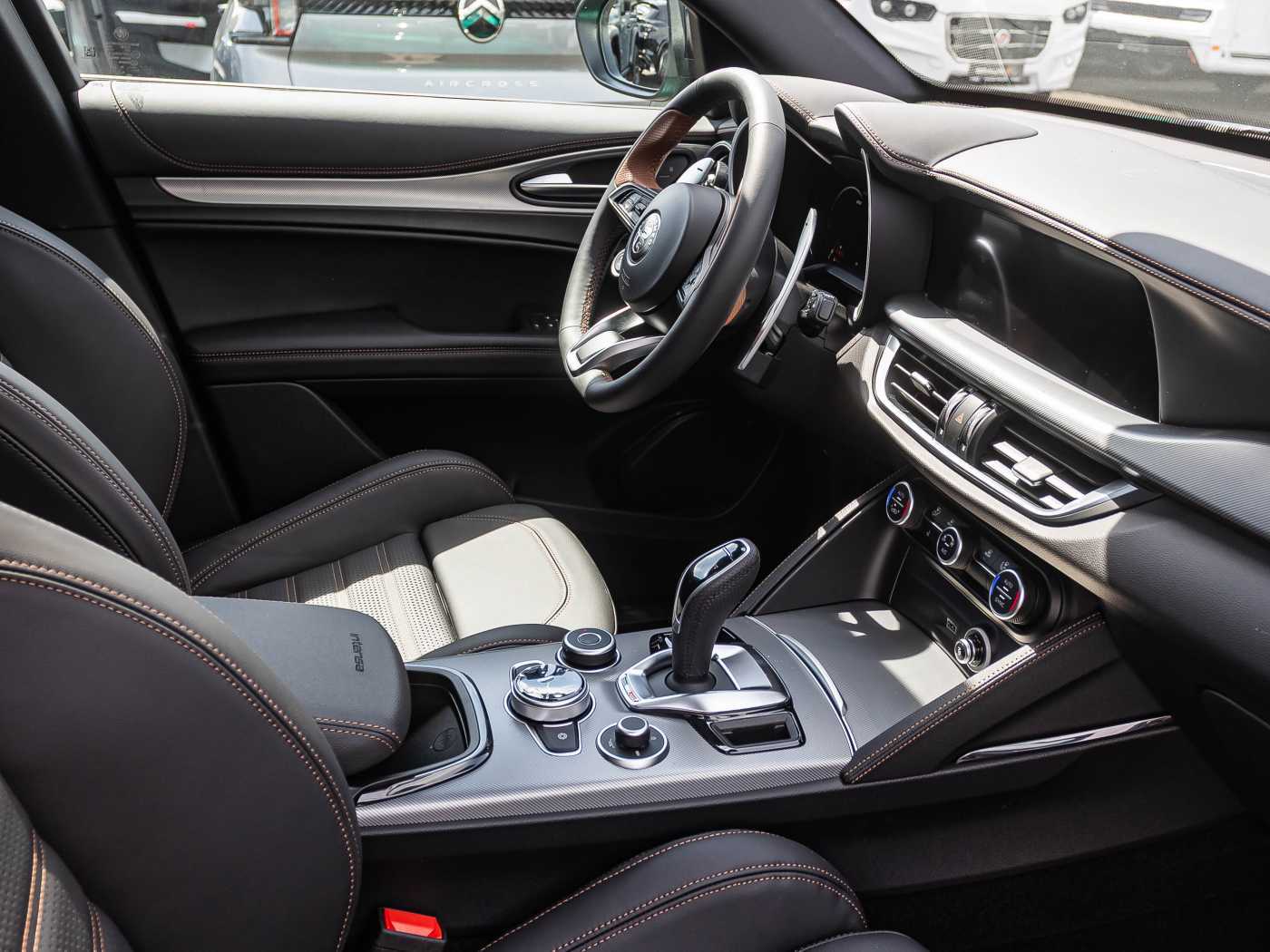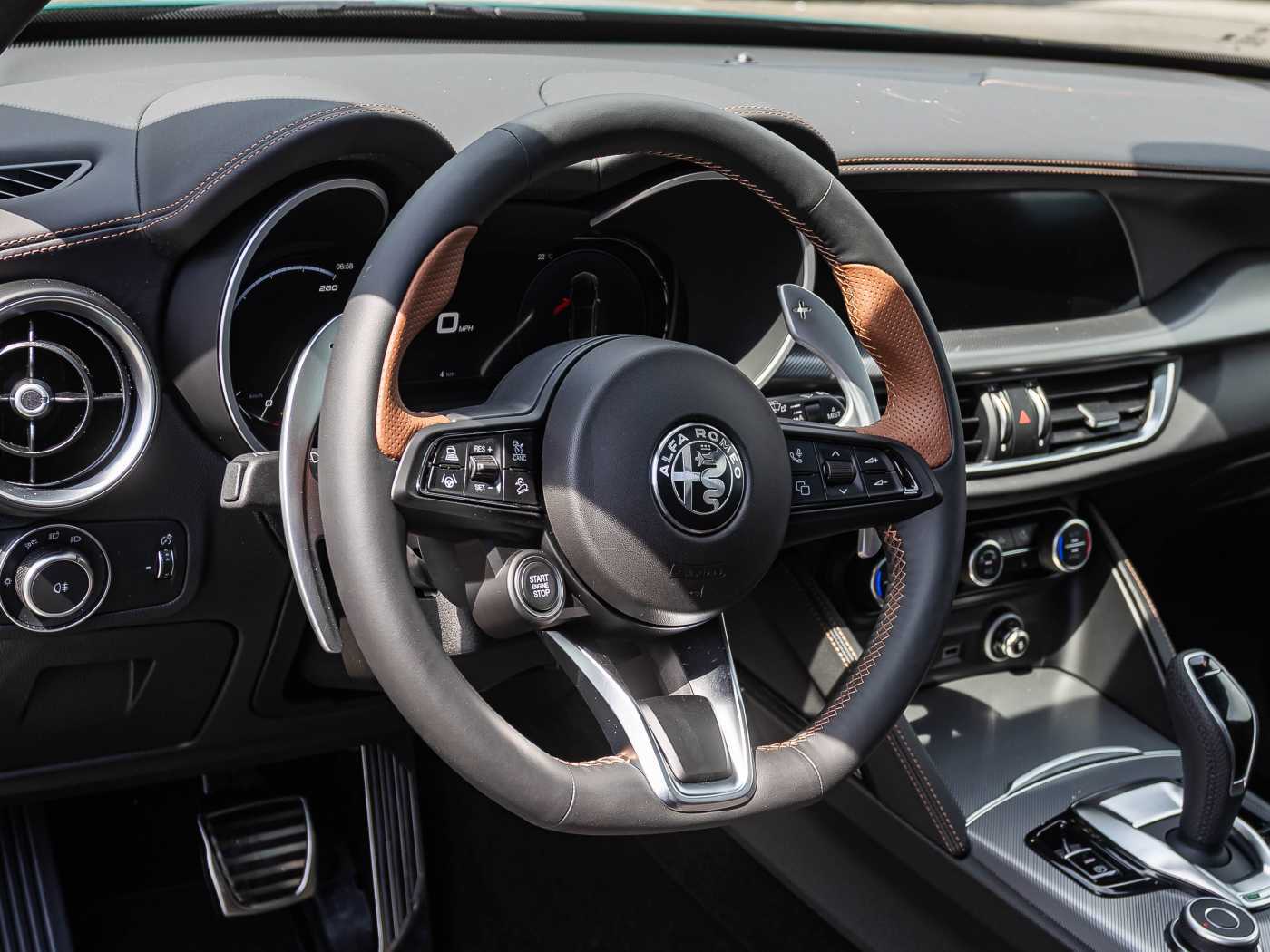- Sport-Lenkrad unten abgeflacht, Leder-/Kunstleder bezogen, mit Startknopf und braunen Akzenten