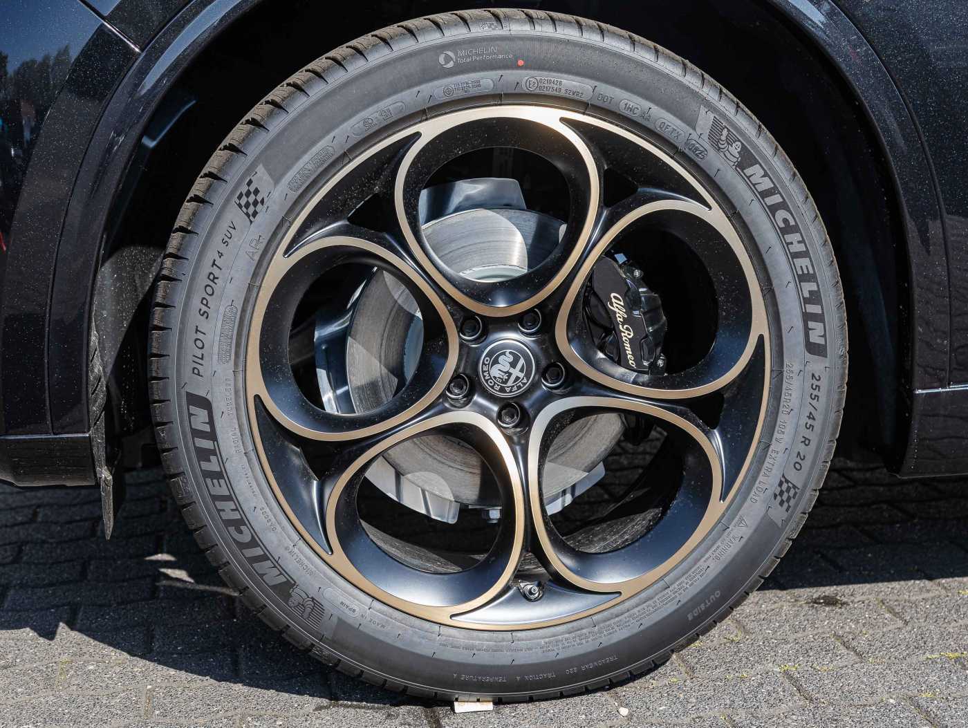 - BREMBO® Bremsanlage mit schwarz lackierte Bremssättel und goldfarbenen Alfa Romeo Schriftzug