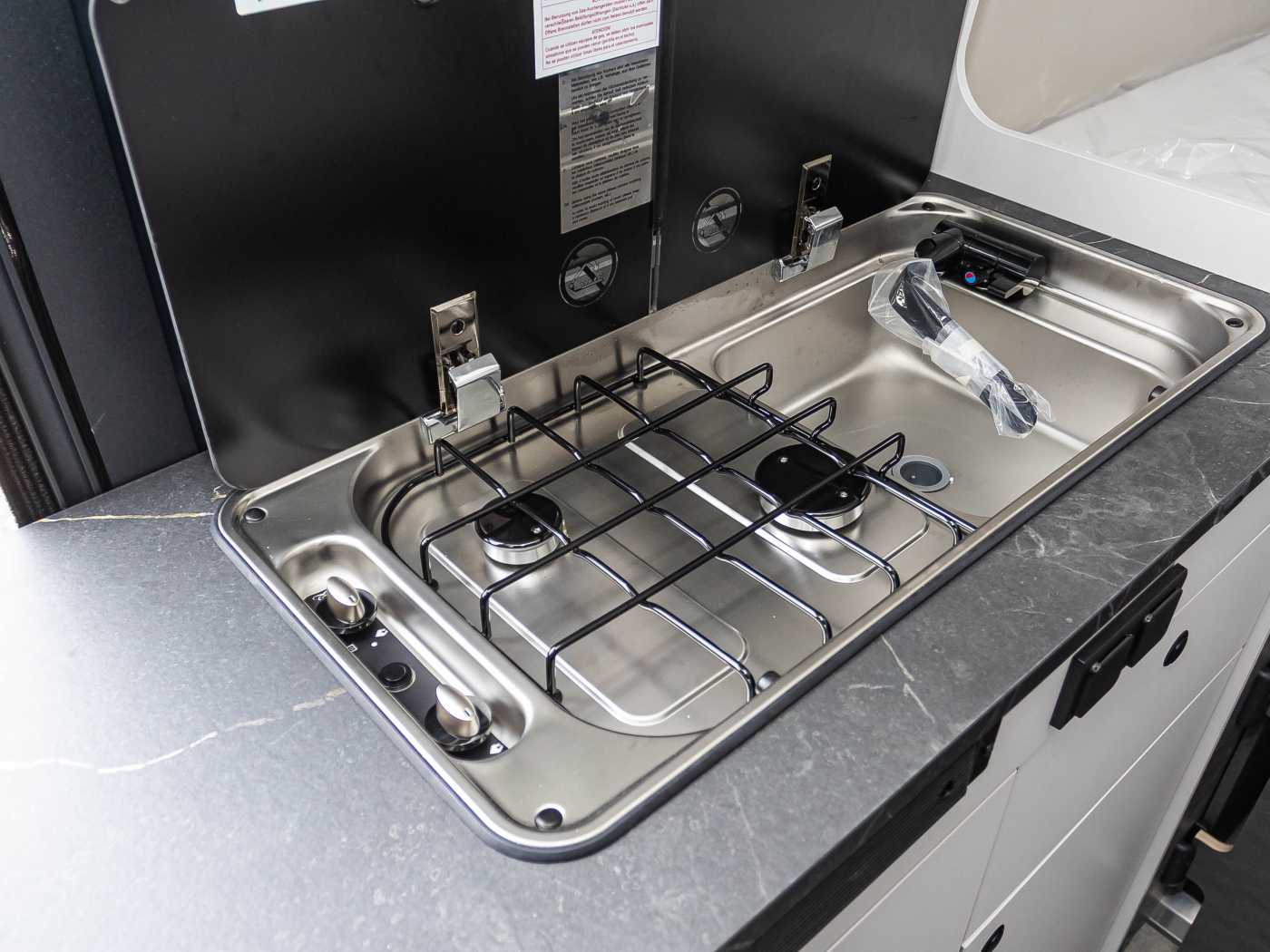 • Ergonomisch angeordnete Küche mit großzügiger Arbeitsfläche • Abstellfläche hinter Kocher • Geräumige Schubkästen mit Soft-Close im Küchenblock • 2-Flamm Gaskocher mit Piezozündung und geteilter Glasabdeckung • Kompressorkühlschrank 84 l mit 6 l Gefrierfach • Flex-Schienensystem mit 2 Haken (außer CV 540 DB) • Frischwassertankkapazität 100 l, Abwassertank 90 l