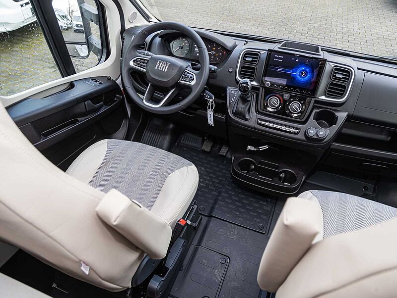 • Fiat Ducato 2,2 l Multi-Jet mit 103 kW | 140 PS, Abgasnorm EURO 6d • Start & Stop Funktion • Frontantrieb • Breitspurfahrwerk • Scheibenbremsen, Hinter- und VorderachsStabilisator, Umluftheizung, Drehzahlmesser • Servolenkung, höhenverstellbare Scheinwerfer, Wegfahrsperre, 3-Punkt-Sicherheitsgurt mit Gurtwarner (für Pilotensitze)