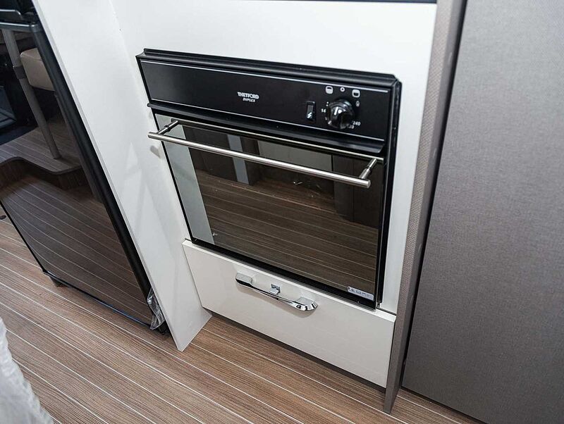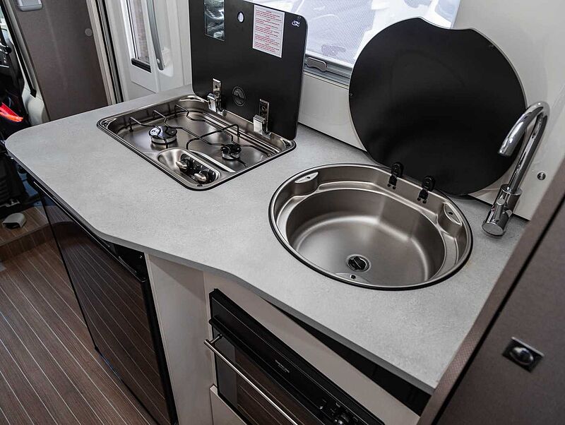 • Ergonomisch angeordnete Küche mit großzügiger Arbeitsfläche • Geräumige Schubkästen mit Soft-Close im Küchenblock • Indirekte LED-Beleuchtung unter Arbeitsplatte • Zwei-Flammkocher mit 12 V Zündung und Glasabdeckung (T 7400 SBC | QBC) • Drei-Flammkocher mit 12 V Zündung und Glasabdeckung • Großes Rundspülbecken aus Edelstahl mit Abdeckung • Flex-Schienensystem mit 2 Haken • Frischwassertankkapazität 110 l, Abwassertank 90 l • Kühlschrank 78 l mit Gefrierfach 11 l (T 5900 FB) • Kühlschrank 137 l mit Gefrierfach 15 l • Abfalleimer
