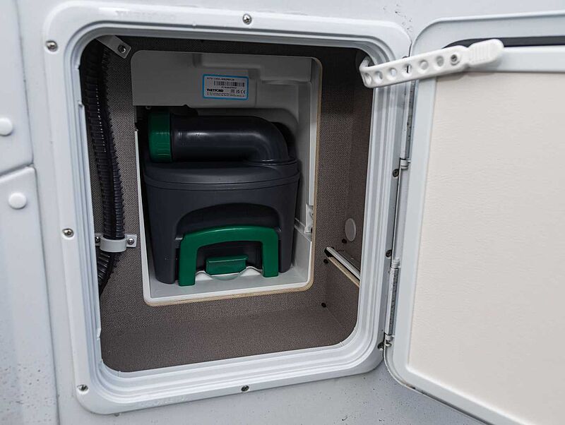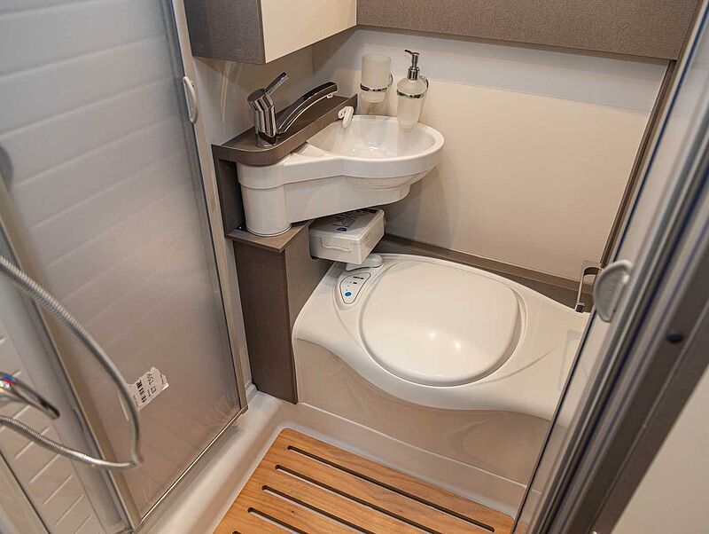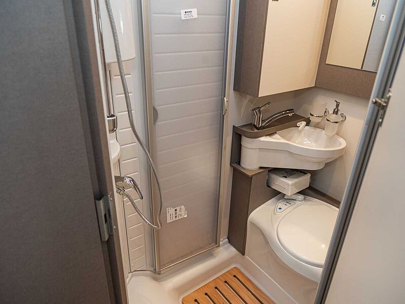 Duschraum (T 5900 FB) • Kassettentoilette mit elektrischer Pumpe und drehbarem Sitz • Duschraumverkleidung • Dachhaube mit integriertem Insektenschutzrollo • Große Spiegelflächen • Kleiderstange in der Nasszelle