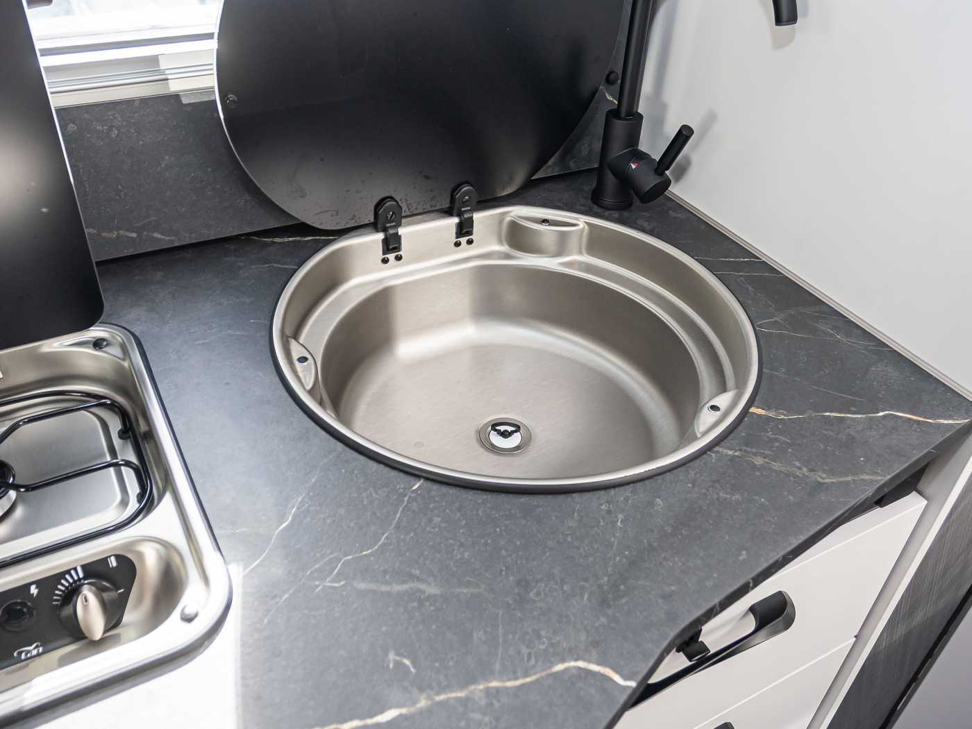 • Ergonomisch angeordnete Küche mit großzügiger Arbeitsfläche • Geräumige Schubkästen mit Soft-Close im Küchenblock • Indirekte LED-Beleuchtung unter Arbeitsplatte • Zwei-Flammkocher mit 12 V Zündung und Glasabdeckung (T 7400 SBC | QBC) • Drei-Flammkocher mit 12 V Zündung und Glasabdeckung • Großes Rundspülbecken aus Edelstahl mit Abdeckung • Flex-Schienensystem mit 2 Haken • Frischwassertankkapazität 110 l, Abwassertank 90 l • Kühlschrank 78 l mit Gefrierfach 11 l (T 5900 FB) • Kühlschrank 137 l mit Gefrierfach 15 l • Abfalleimer