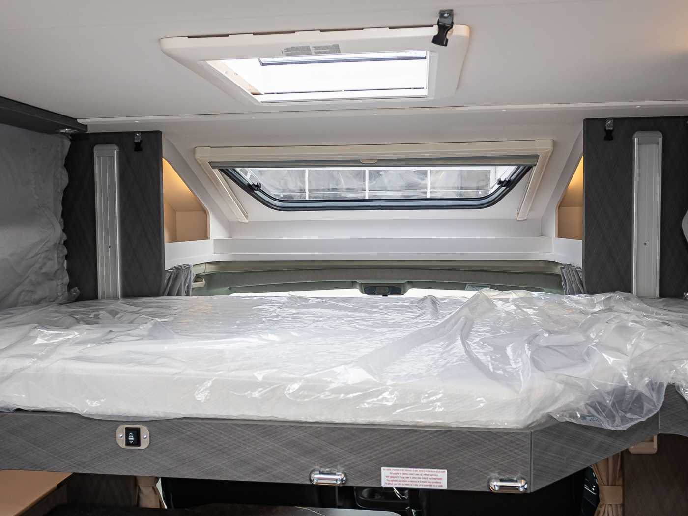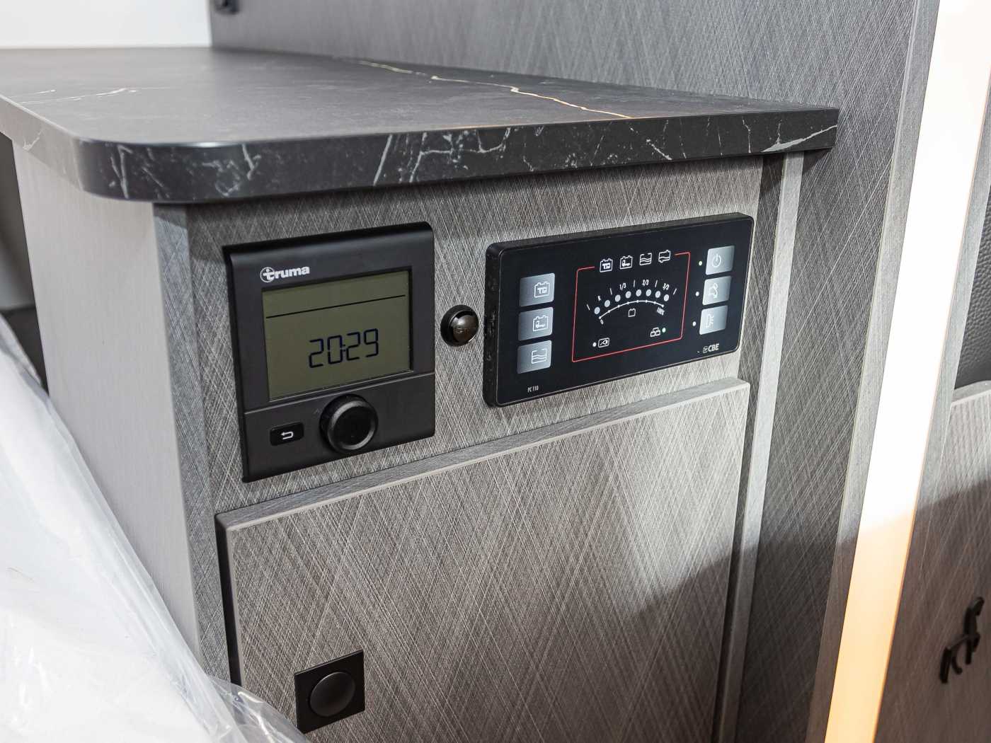 • LED-Wohnraumleuchte • Leistungsstarke, wartungsfreie Aufbaubatterie (95 Ah) • Bord-Control-Panel • Elektrischer Ladeautomat für Aufbau- und Fahrzeugbatterie 12 V | 18 A • CEE-Außenanschluss für 230 V mit Sicherungsautomat