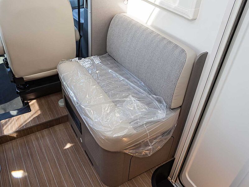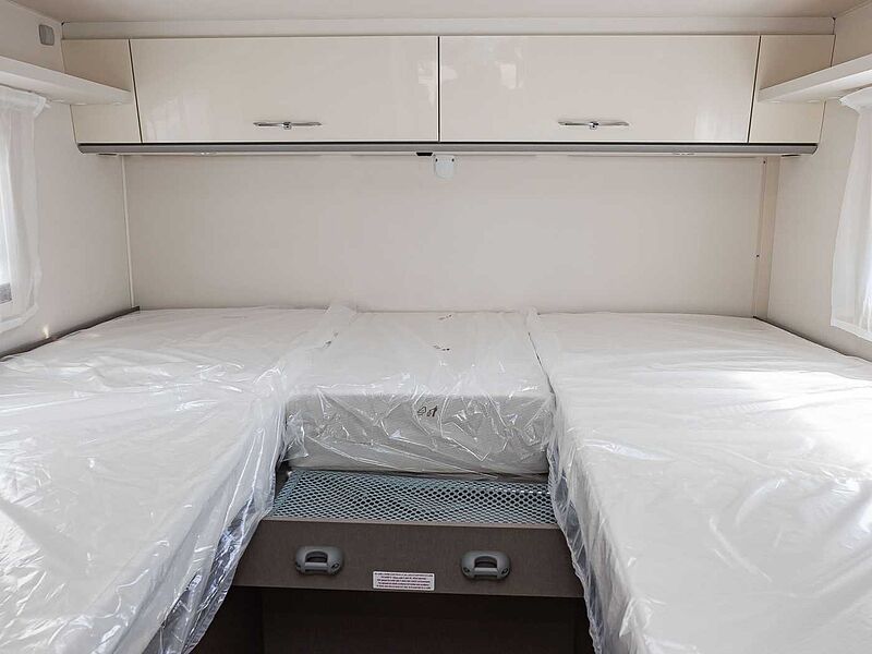 Liegekomfort • Matratzenbezüge abnehmbar und waschbar • Bettenumbau Einzelbett zu Doppelbett • Holzlattenrost in allen Festbetten für erhöhten Liegekomfort • Großzügige Stauräume und Ablagemöglichkeiten • Dachstauschränke mit Soft-Close Schließsystem • Möbeldekor Tela Sand and White • Fußboden Nautic Breeze • Isofix Kindersitzbefestigung für Couch-Couch Sitzgruppe ( T 7.3 SCF | QCF)