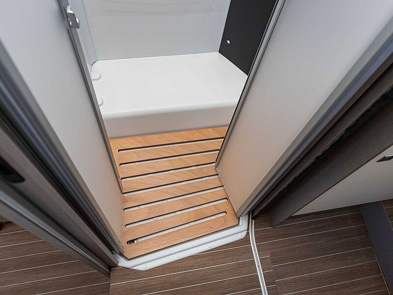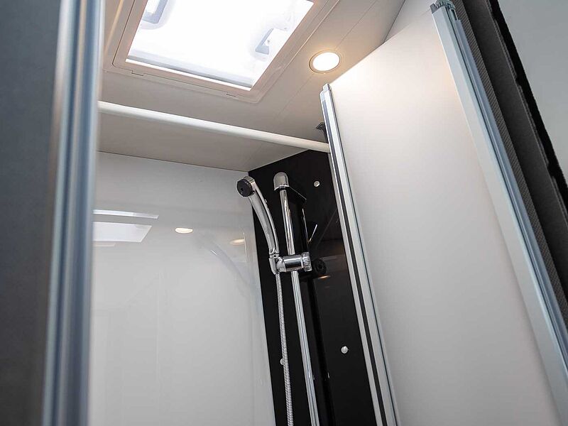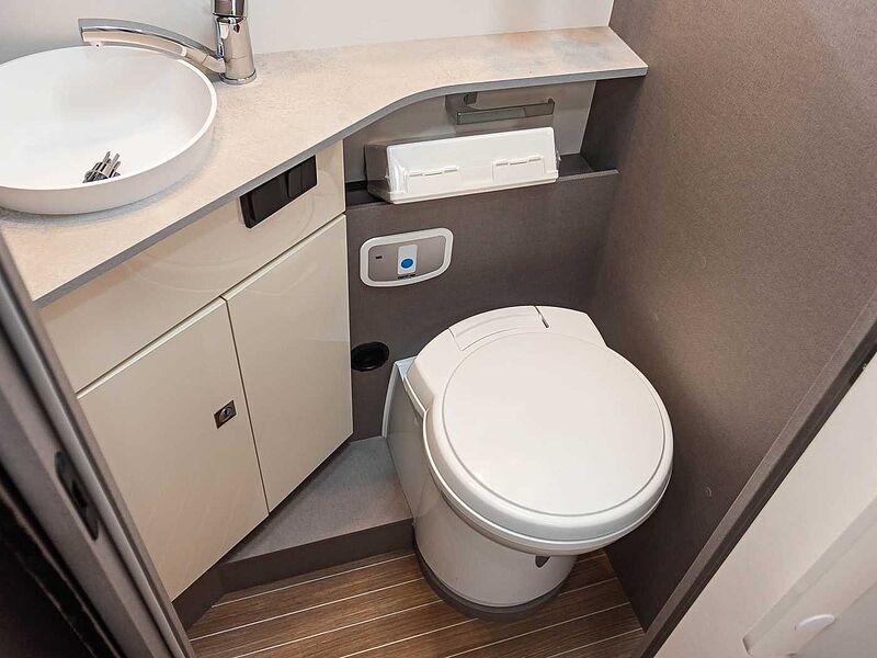 • Variobad (T 6.9 SF) • Geräumiges Raumbad mit gegenüberliegender separater Dusche • Kassettentoilette mit elektrischer Pumpe und drehbarem Sitz • Duschraumverkleidung • Dachhaube mit integriertem Insektenschutzrollo • Große Spiegelflächen • Kleiderstange in der Nasszelle