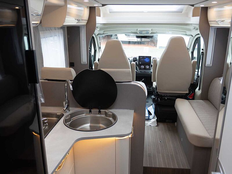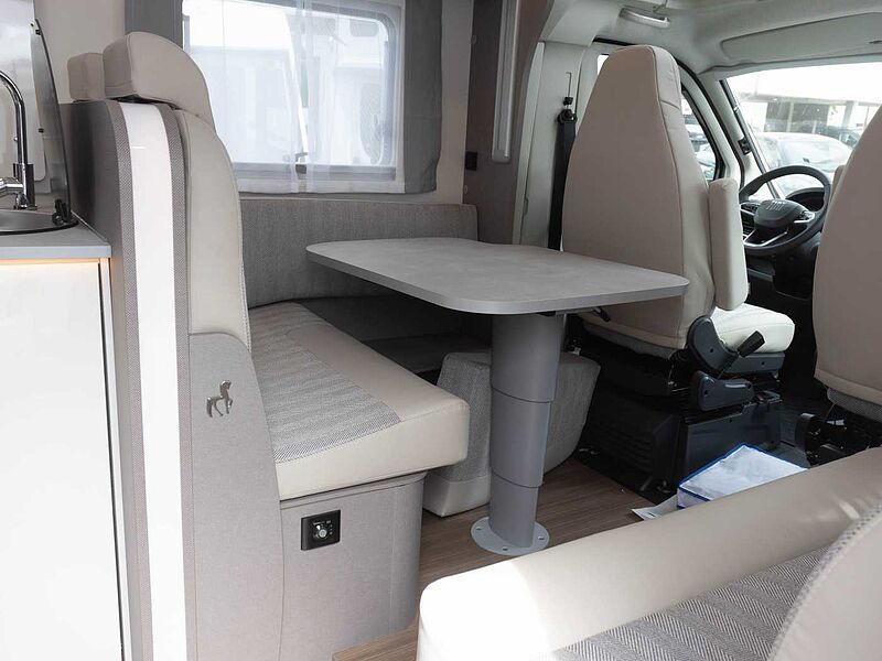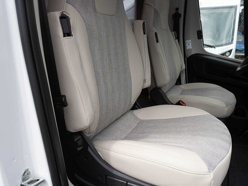 FAHRGESTELL / BASISFAHRZEUG • Fiat Ducato, 2,3 Multi-Jet mit 104 kW / 140 PS, Multijet-Direkteinspritzung, Abgasnorm EURO 6 • Dieseltank 75 ltr. • Breitspurfahrwerk • Frontantrieb • Tagfahrlicht im Serienschweinwerfer integriert • Fahrerairbag • ABS, EBD, ESP inkl. ASR und Hillholder • Scheibenbremsen, Umluftheizung, Drehzahlmesser, Servolenkung, Wegfahrsperre, 3-Punkt-Sicherheitsgurt • Elektrische Fensterheber und Zentralverriegelung im Fahrerhaus bei Teilintegrierten • Frontstoßfänger in Wagenfarbe lackiert • Pannen-Set Fix & Go Kit • Getränkehalter in der Mittelkonsole • Komfortable Fahreigenschaften durch Hinter- und Vorderachs-Stabilisatoren • Stahlfelgen 15“ inkl. Radzierblenden • Tabletholder und USB-Steckdose • Fahrer-/Beifahrersitz in Wohnraumstoff mit Doppelarmlehnen • Fahrer-/Beifahrersitz bei T-Modellen drehbar • Höhen- und Neigungsverstellung für Fahrersitz (für Beifahrersitz optional)