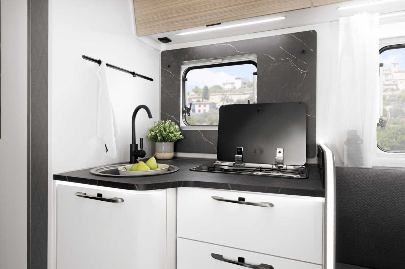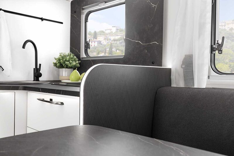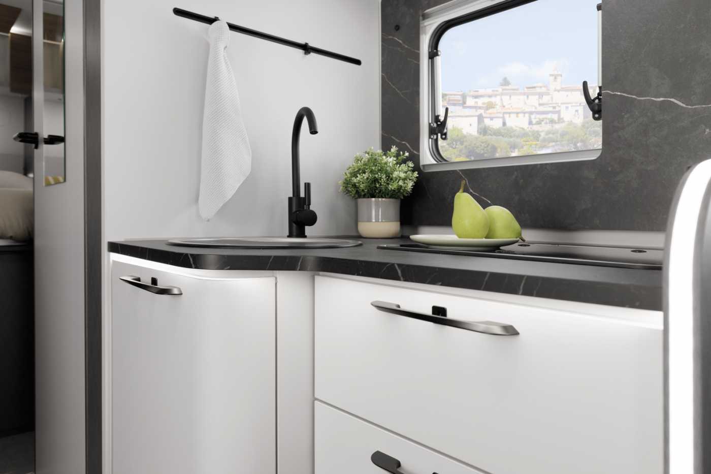 KÜCHE / WASSERVERSORGUNG • Ergonomisch angeordnete Küche mit großzügiger Arbeitsfläche • Geräumige Schubkästen mit Servo-Soft im Küchenblock (modellabhängig) • Drei-Flammkocher mit gusseisernem Topfträger und Glasabdeckung in schwarz (außer T 7400 QBC und T 7400 SBC und Van) • Großes Rundspülbecken aus Edelstahl mit Glasabdeckung in schwarz mit Abdeckung (außer Van) • Wassertank inkl. Boiler 122 l, Abwassertank 92 l • Kühlschrank 113 l mit Gefrierfach 14 l • Indirekte LED-Beleuchtung unter Arbeitsplatte • Abfalleimer