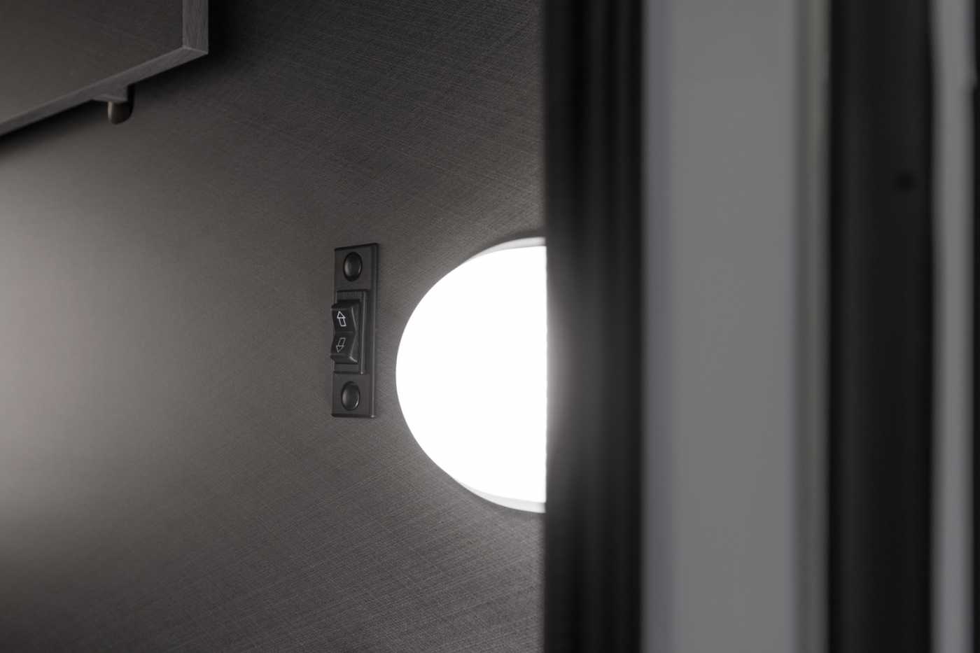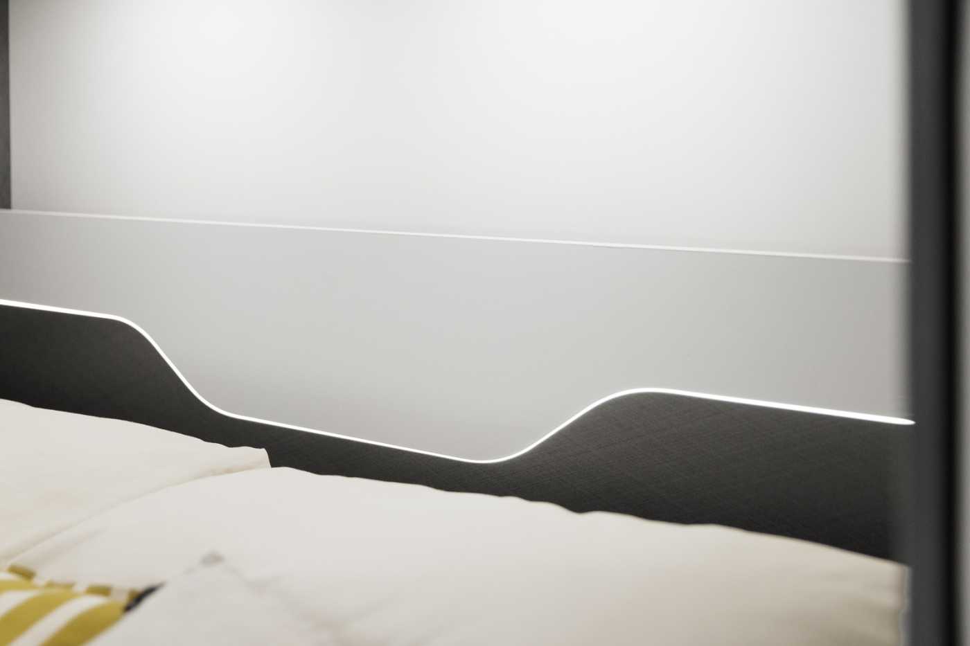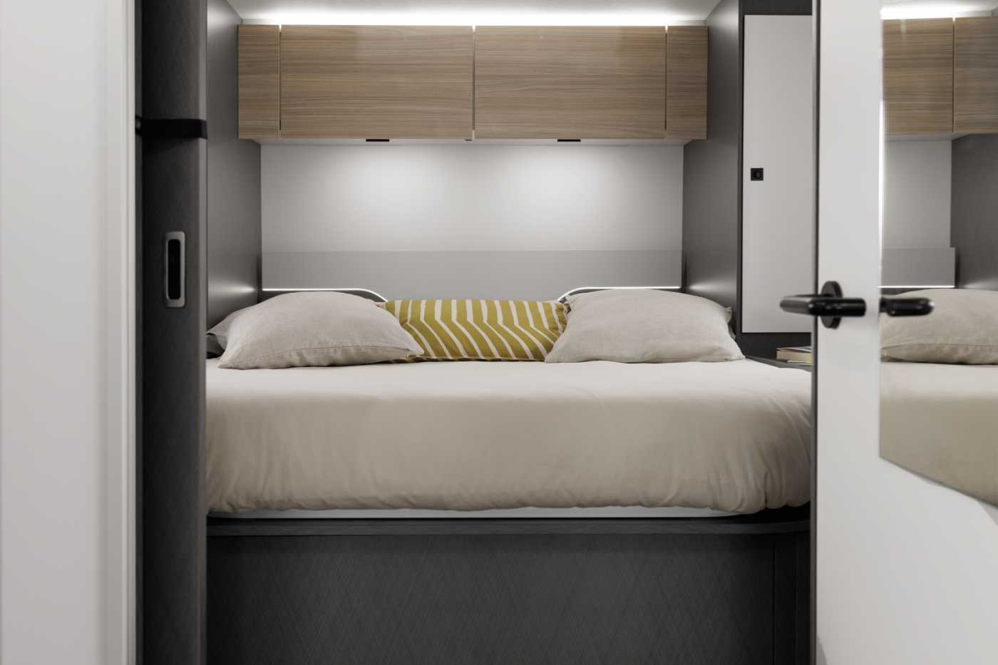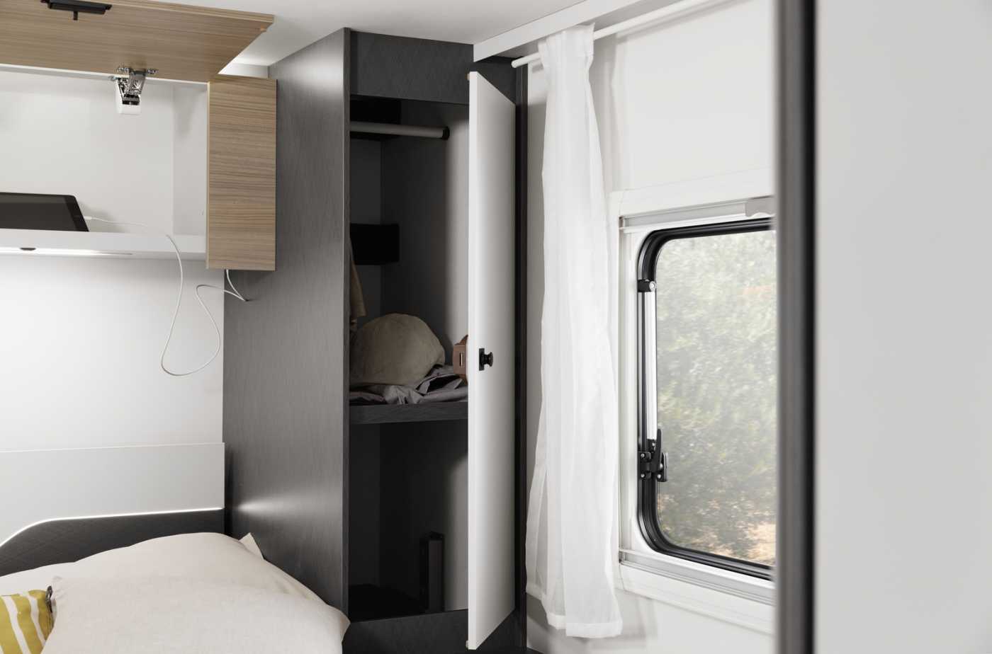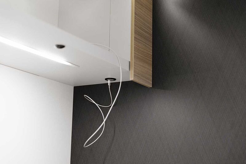 BORDTECHNIK • LED-Beleuchtung integriert unter den Dachschränken • LED-Wohnraumleuchte • Indirekte LED-Beleuchtung im Raumteiler • LED-Außenleuchte • Leistungsstarke, wartungsfreie AGMAufbaubatterie (95 Ah) • Bord-Control-Panel mit Angabe aller Füllstände und Batteriekapazitäten • Zuschalt-/Trennautomatik für Starterund Aufbaubatterie sowie Kühlschrank • Elektrischer Ladeautomat für Aufbauund Fahrzeugbatterie 12 V / 18 A • CEE-Außenanschluss für 230 V mit Sicherungsautomat • FI-Schutzschalter • 4x USB-Steckdose