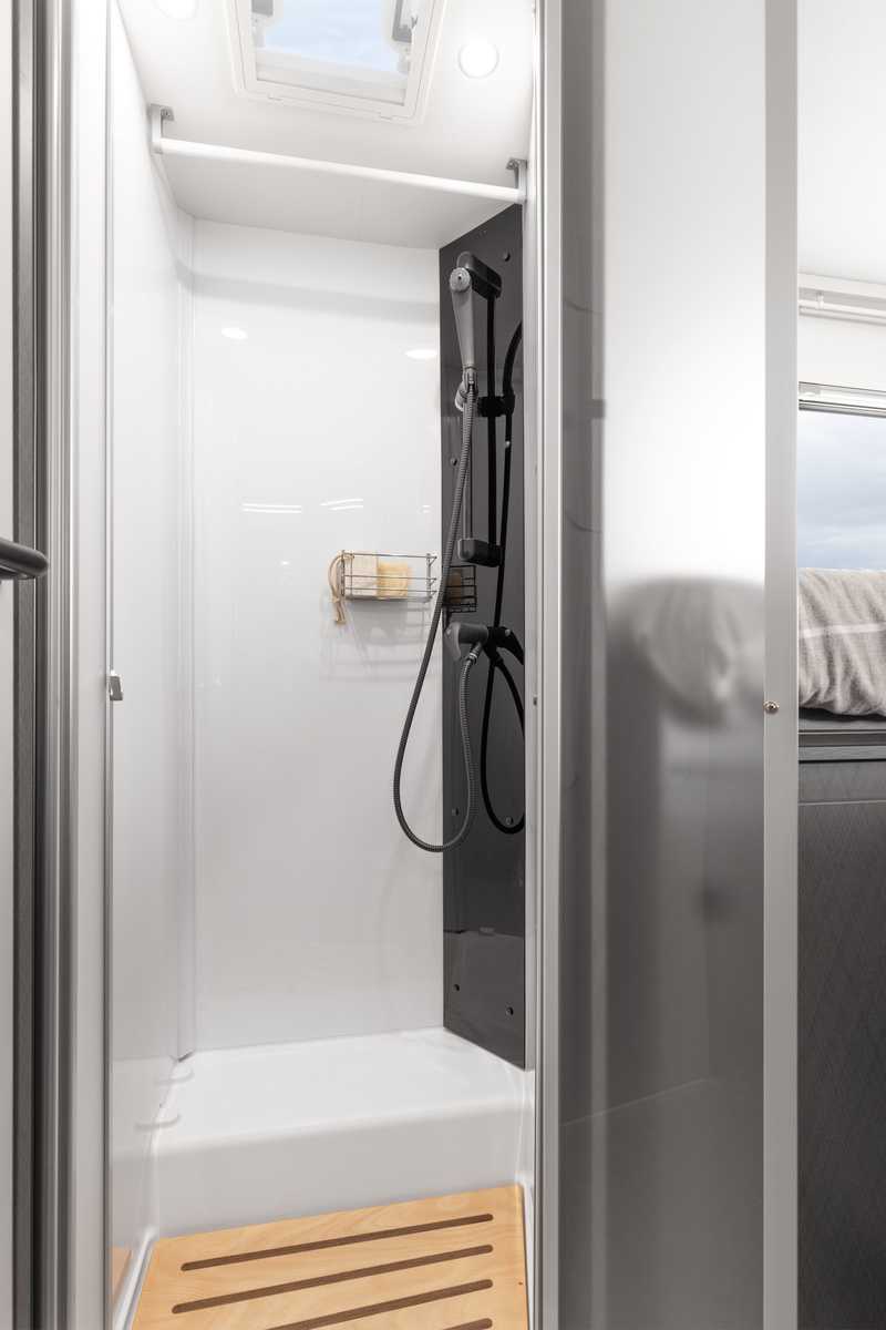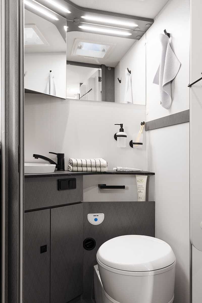 BAD • Variobad im T 6900 SB, T 7300 SB, V5900 DB & V6600 SB • Geräumiges Raumbad mit gegenüberliegender separater Dusche im T 6900 DB/QB, T 7400 SB/QB/QBC/SBC • Bad mit Banktoilette und integriertem Duschraum im T 5900 FB • Kassettentoilette mit elektrischer Pumpe und drehbarem Sitz (außer T 5900 FB) • Dachhaube mit integriertem Insektenschutzrollo (modellabhängig) • Große Spiegelflächen • Kleiderstange in der Nasszelle • Flex-Schienensystem mit 2 Haken (außer T 6900 SB, T 7300 SB, A 6600 BB und A 7300 DB)