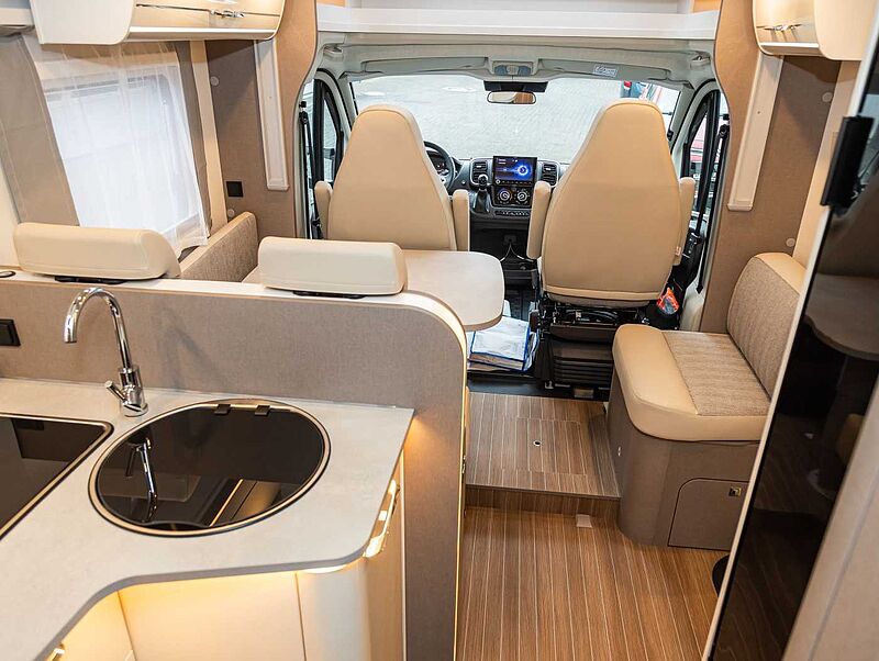 FAHRGESTELL / BASISFAHRZEUG • Fiat Ducato, 2,3 Multi-Jet mit 104 kW / 140 PS, Multijet-Direkteinspritzung, Abgasnorm EURO 6 • Dieseltank 75 ltr. • Breitspurfahrwerk • Frontantrieb • Tagfahrlicht im Serienschweinwerfer integriert • Fahrerairbag • ABS, EBD, ESP inkl. ASR und Hillholder • Scheibenbremsen, Umluftheizung, Drehzahlmesser, Servolenkung, Wegfahrsperre, 3-Punkt-Sicherheitsgurt • Elektrische Fensterheber und Zentralverriegelung im Fahrerhaus bei Teilintegrierten • Frontstoßfänger in Wagenfarbe lackiert • Pannen-Set Fix & Go Kit • Getränkehalter in der Mittelkonsole • Komfortable Fahreigenschaften durch Hinter- und Vorderachs-Stabilisatoren • Stahlfelgen 15“ inkl. Radzierblenden • Tabletholder und USB-Steckdose • Fahrer-/Beifahrersitz in Wohnraumstoff mit Doppelarmlehnen • Fahrer-/Beifahrersitz bei T-Modellen drehbar • Höhen- und Neigungsverstellung für Fahrersitz (für Beifahrersitz optional)