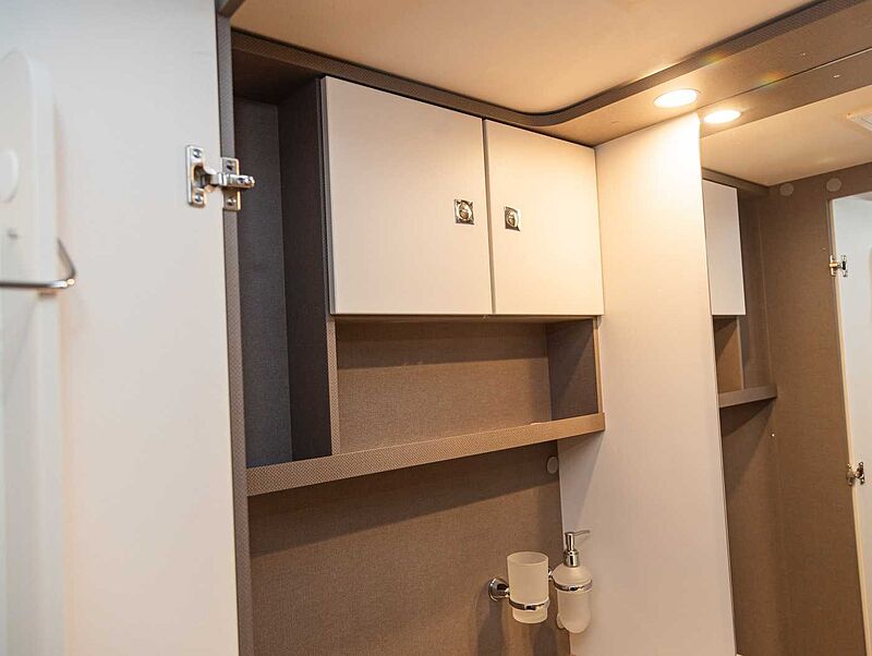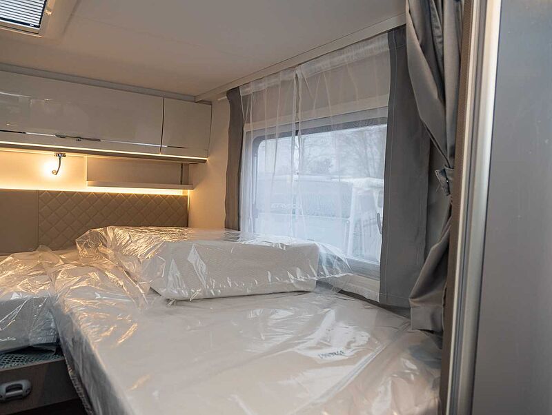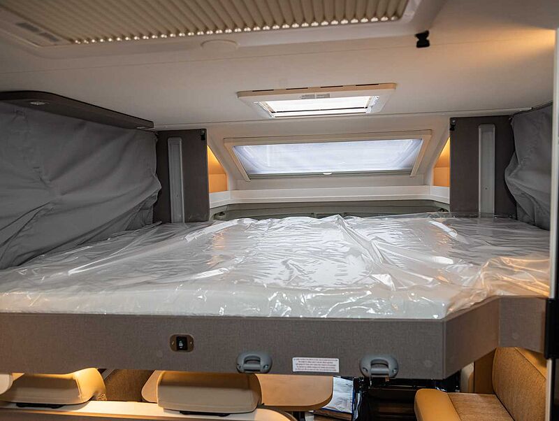 KOMFORT PAKET Panoramadachhaube über Küche, Klarglasdachhaube 40x40, Duschraumverkleidung, Spiegel mit indirekter Beleuchtung und Garderobenhaken, Holzlattenrost in der Dusche, Captain Chairs inkl. Wohnraumbezüge, zusätzl. Steckdose im Dachschrank über dem Küchenblock, Steckdose in der Garage