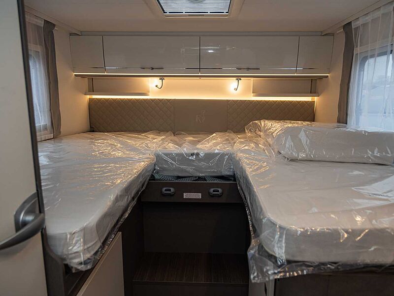 WOHN-/SCHLAFKOMFORT • Ergonomisch geformte Polster für mehr Sitzkomfort • Gemütliche L-Sitzgruppe mit freistehendem, dreh- und schwenkbaren Tisch beim T 7400 QB / T 7400 SB • Tischplattenverlängerung (außer T 7400 QB / T 7400 QBC / T 7400 SBC / T 7400 SB / A 7300 DB / A 6600 BB) • Gemütliche Lounge-Sitzgruppe mit freistehendem Tisch beim zum Abklappen beim T 7400 QBC und T 7400 SBC • Hochwertige Matratzen mit erhöhtem Liegekomfort in allen Betten • Matratzenbezüge abnehmbar und waschbar • Großzügige Stauräume und Ablagemöglichkeiten • Hinterlüftete Stauschränke und Truhen • Komfortabler Alkoven mit Seitenfenster rechts, 66 cm Kopffreiheit (A-Modelle) • Alkovenbett klappbar für besseren Zugang zum Fahrerhaus (A-Modelle) • Sicherheitsnetze am Alkoven-Bett • Möbeldekor Tela Sand & White • Fußboden Nautic Breeze