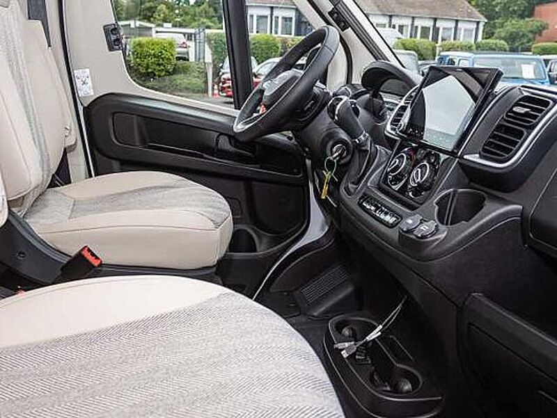 FAHRGESTELL / BASISFAHRZEUG • Fiat Ducato, 2,3 Multi-Jet mit 104 kW / 140 PS, Multijet-Direkteinspritzung, Abgasnorm EURO 6 • Dieseltank 75 ltr. • Breitspurfahrwerk • Frontantrieb • Tagfahrlicht im Serienschweinwerfer integriert • Fahrerairbag • ABS, EBD, ESP inkl. ASR und Hillholder • Scheibenbremsen, Umluftheizung, Drehzahlmesser, Servolenkung, Wegfahrsperre, 3-Punkt-Sicherheitsgurt • Elektrische Fensterheber und Zentralverriegelung im Fahrerhaus bei Teilintegrierten • Frontstoßfänger in Wagenfarbe lackiert • Pannen-Set Fix & Go Kit • Getränkehalter in der Mittelkonsole • Komfortable Fahreigenschaften durch Hinter- und Vorderachs-Stabilisatoren • Stahlfelgen 15“ inkl. Radzierblenden • Tabletholder und USB-Steckdose • Fahrer-/Beifahrersitz in Wohnraumstoff mit Doppelarmlehnen • Fahrer-/Beifahrersitz bei T-Modellen drehbar • Höhen- und Neigungsverstellung für Fahrersitz (für Beifahrersitz optional)