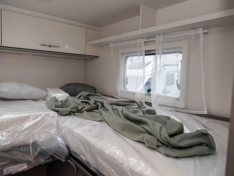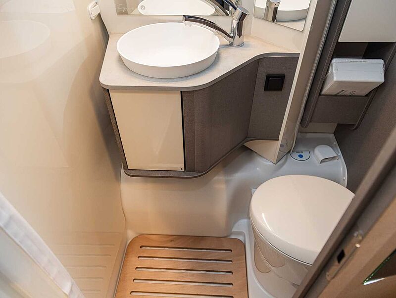 und Glasabdeckung • Geräumige Schubkästen mit Soft-Close im Küchenblock • Kühlschrank 78 l mit Gefrierfach 11 l • Frischwassertankkapazität 110l, Abwassertank 100l (V 5.9 DF: 95l) • Abfalleime