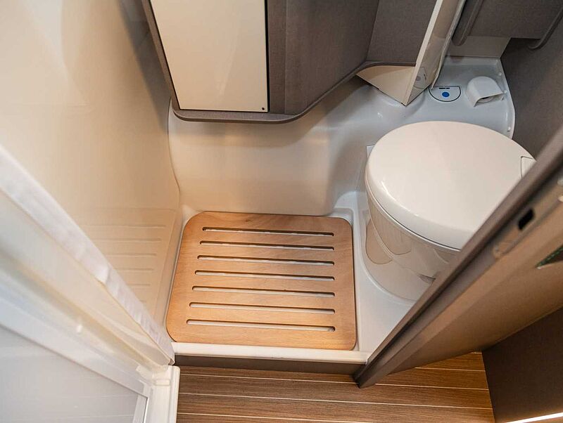 • Variobad • Duschraumverkleidung • Dachhaube mit integriertem Insektenschutzrollo • Große Spiegelflächen • Kleiderstange in der Nasszelle