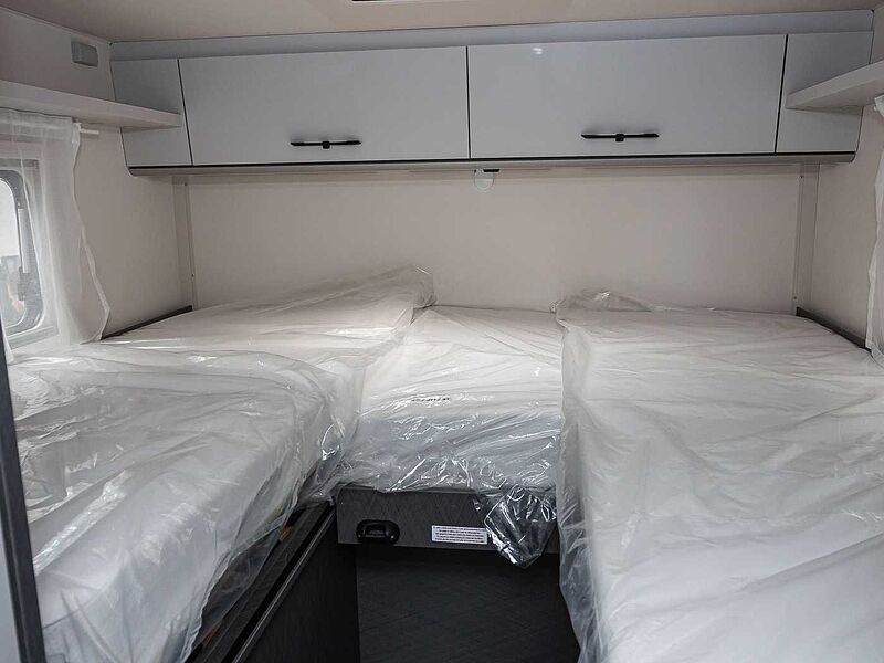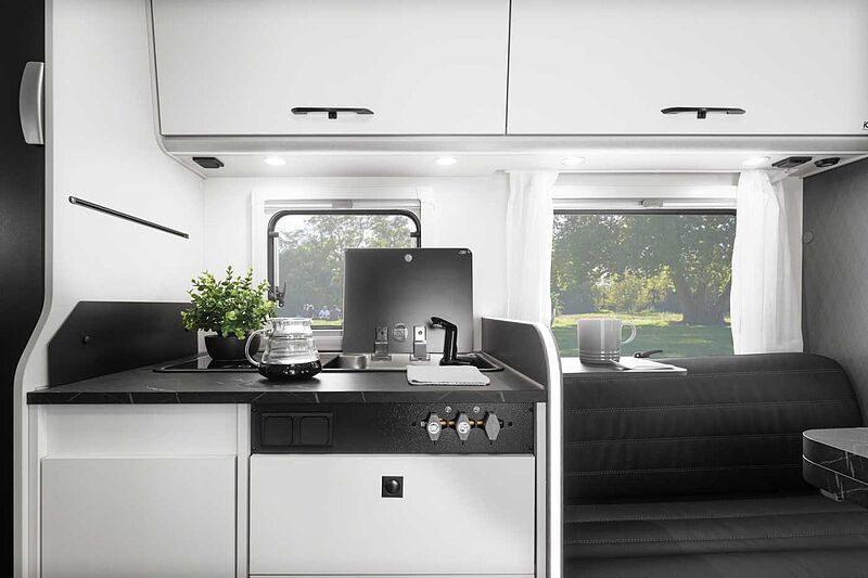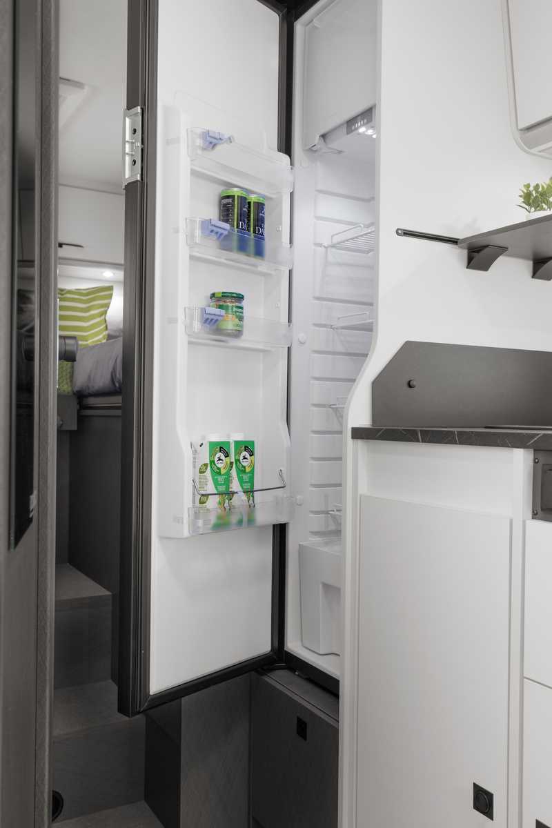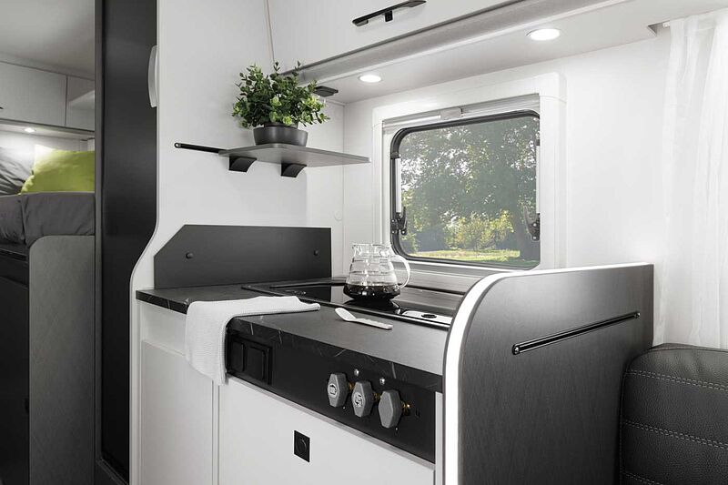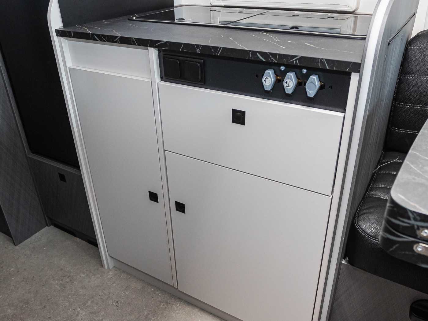 und Glasabdeckung • Geräumige Schubkästen mit Soft-Close im Küchenblock • Kühlschrank 78 l mit Gefrierfach 11 l • Frischwassertankkapazität 110l, Abwassertank 100l (V 5.9 DF: 95l) • Abfalleime