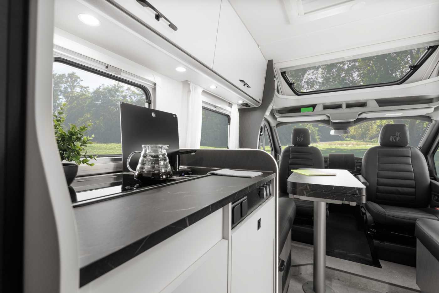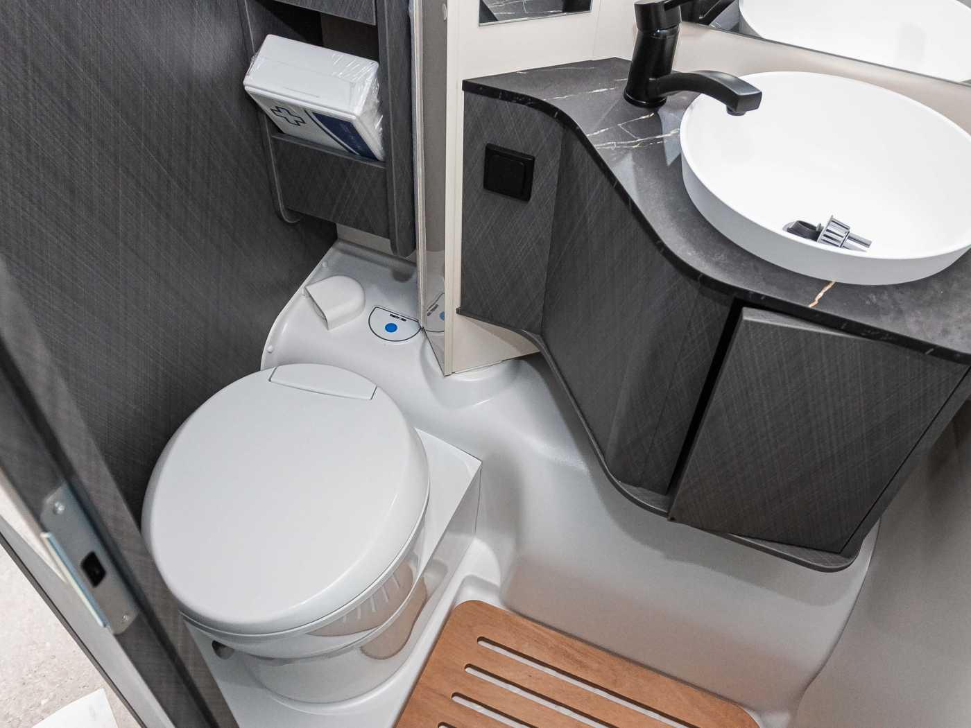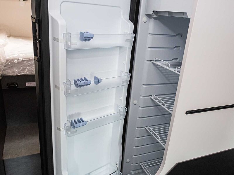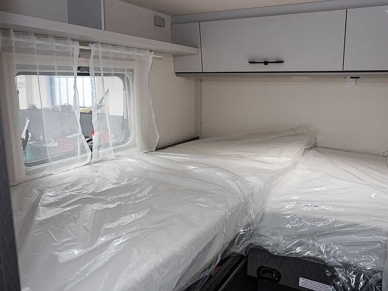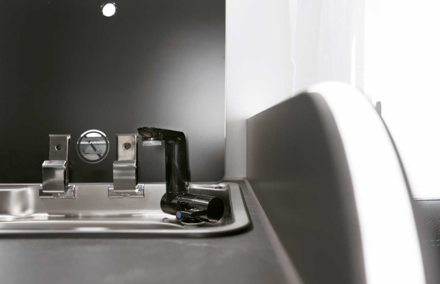 und Glasabdeckung • Geräumige Schubkästen mit Soft-Close im Küchenblock • Kühlschrank 78 l mit Gefrierfach 11 l • Frischwassertankkapazität 110l, Abwassertank 100l (V 5.9 DF: 95l) • Abfalleime