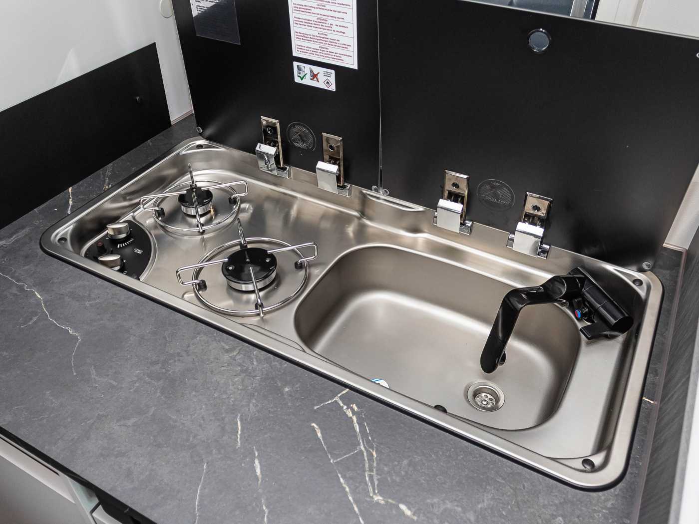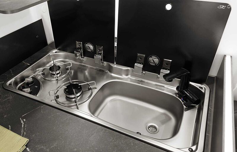 • Ergonomisch angeordnete Küche mit großzügiger Arbeitsfläche • 2-Flammkocher mit Piezozündung