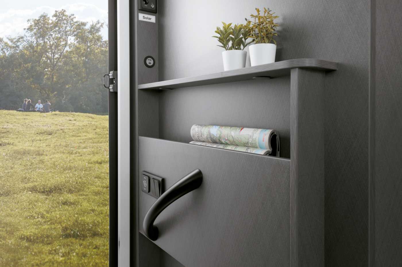 • Ausstellfenster doppeltverglast mit Verdunkelungsrollo und Fliegenschutz • Fahrerhaus-Vorhang • Aufbautür mit ergonomischer Griffposition innen und außen • Fliegengittertür • Elektrische Trittstufe