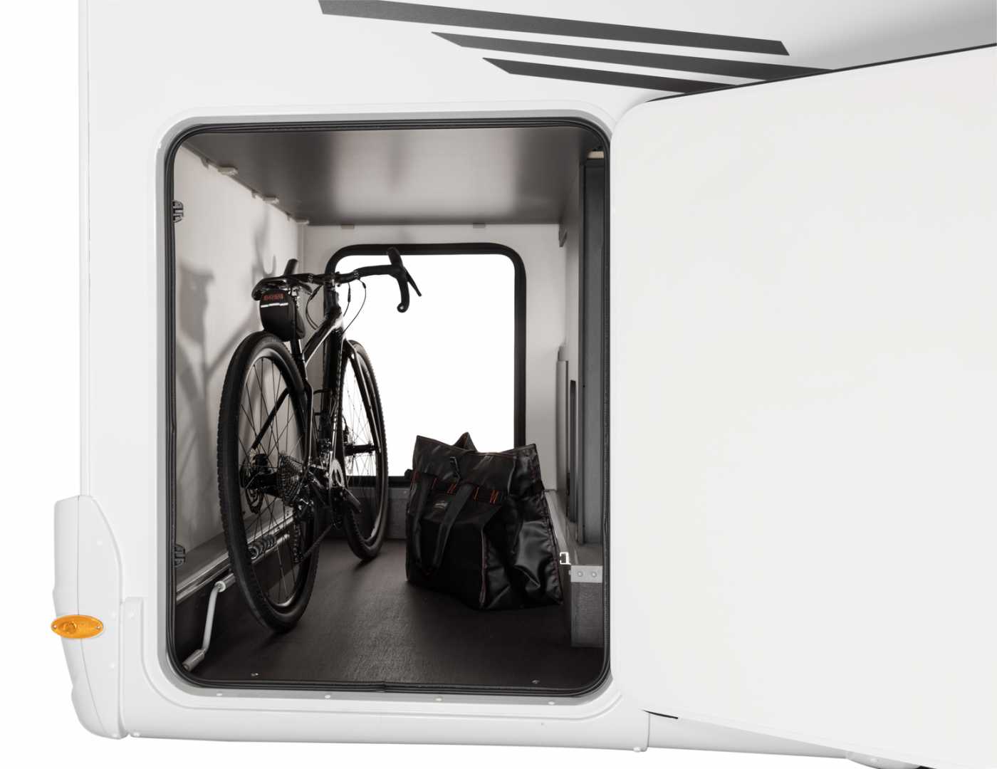 • Formschöner Heckleuchtenträger dreiteilig mit integrierten Leuchten • Großzügige Heckgarage mit Verzurrösen und Innenbeleuchtung • 2. Außenstauraumklappe (Größe modellabhängig) • Zuladung Heckgarage bis zu 150 kg