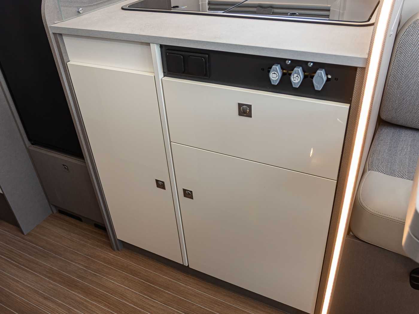 und Glasabdeckung • Geräumige Schubkästen mit Soft-Close im Küchenblock • Kühlschrank 78 l mit Gefrierfach 11 l • Frischwassertankkapazität 110l, Abwassertank 100l (V 5.9 DF: 95l) • Abfalleime