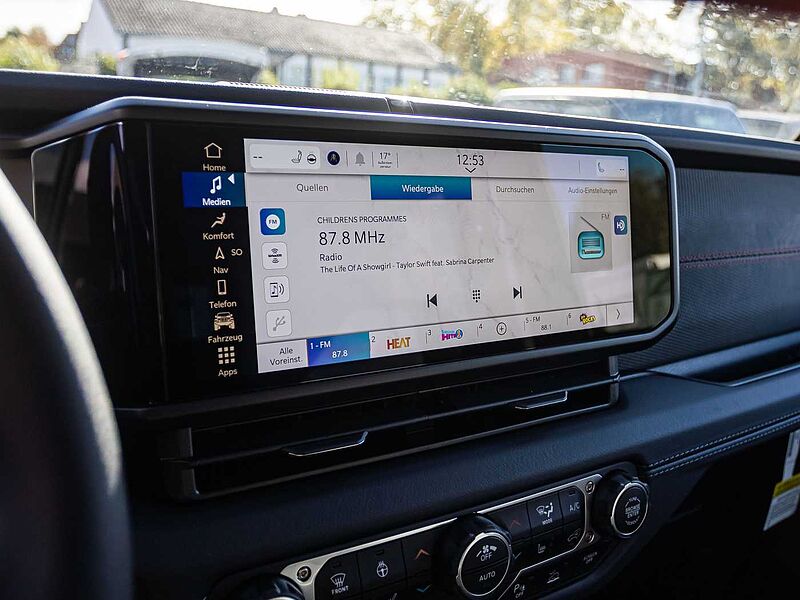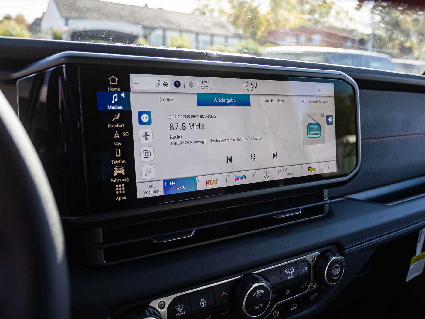 - Technology Pack: Uconnect NAV mit 12,3 Zoll Bildschirm, Freisprecheinrichtung, Offroad-Kamera, Automatisch abblendender Innenspiegel, Alpine-Audiosystem