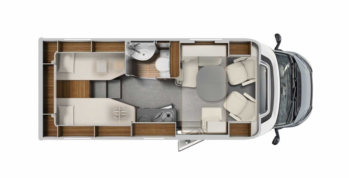 • Komfort Paket Ecovip L (Fahrerhausteppich, Verdunklungsplissee Fahrerhaus (für Front- und Seitenscheiben), Holzeinlage für Duschwanne, Vorbereitung Rückfahrkamera)