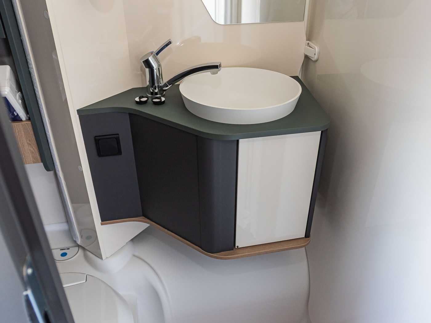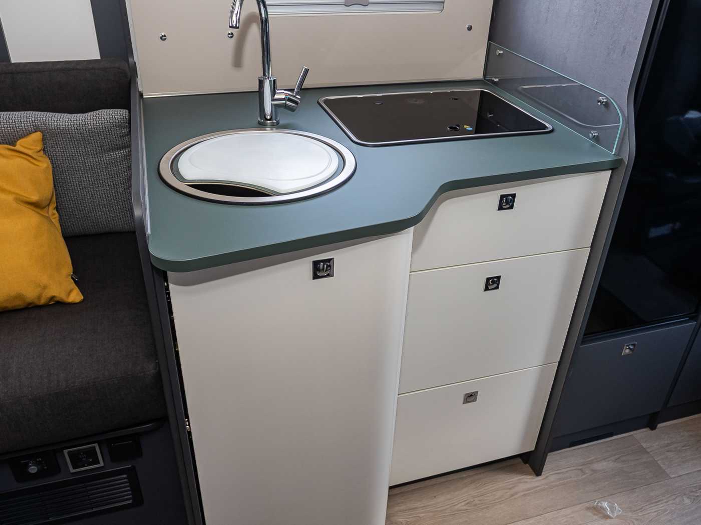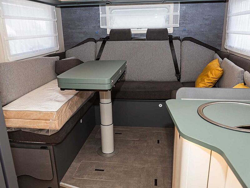 - Komfort Paket Kosmo L (Duscheinlage aus Holz, Fahrerhausteppich, Dunstabzugshaube, Isolierter Abwassertank, Beheizter Abwassertank, T-Haube mit Skyview zum Öffnen, Schlafzimmerwände in Eco-Leder verkleidet, Ausziehkörbe und -schränke in der Küche, Premium XL-Aufbautür mit Fernbedienung, Zentralverriegelung, Fenster Verdunkelung, Ablagefach und Gasdruckstoßdämpfer, Vorbereitung Rückfahrkamera, Auf den Wohnraum abgestimmte Sitzbezüge)