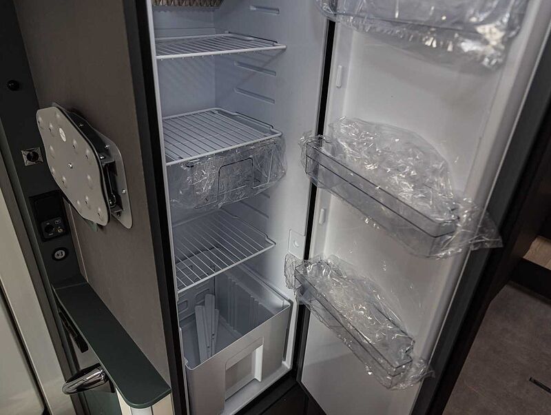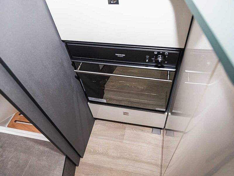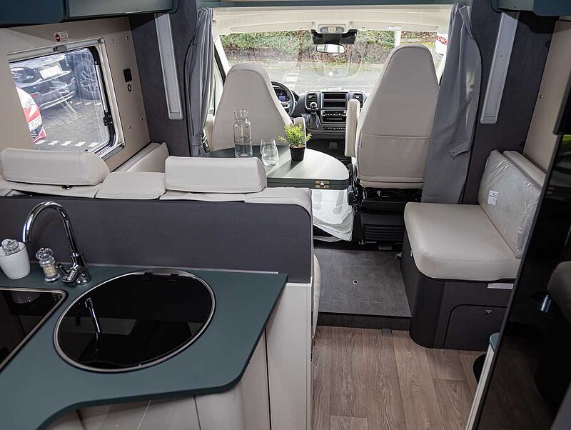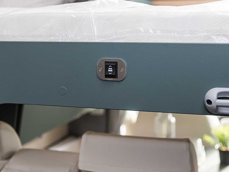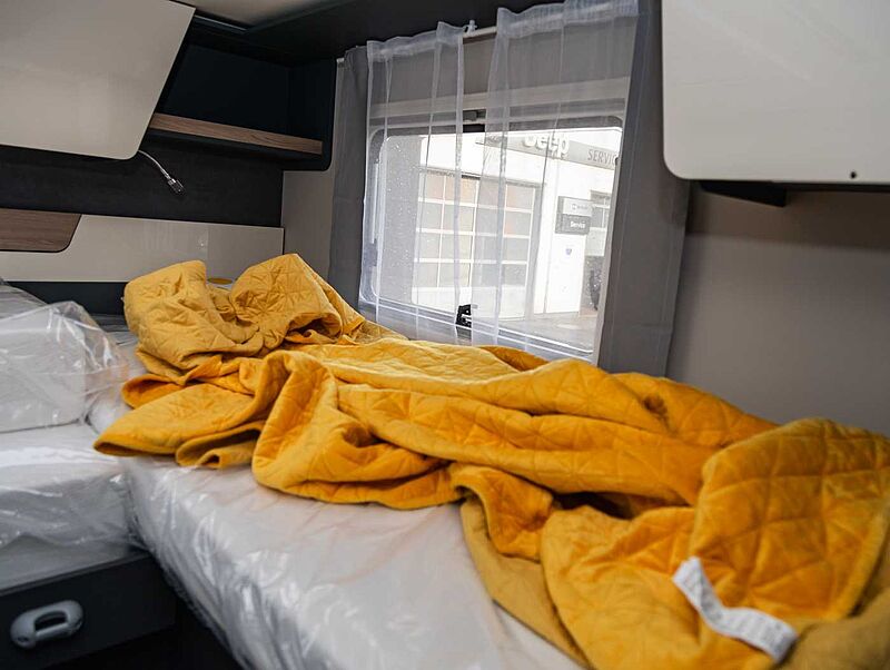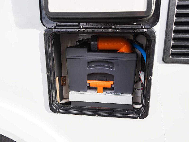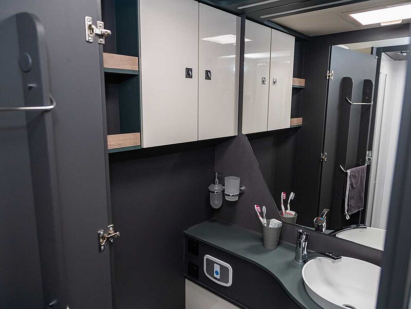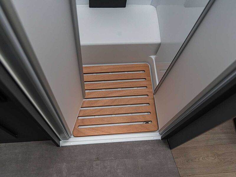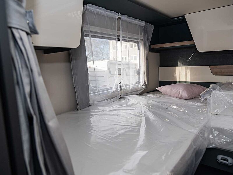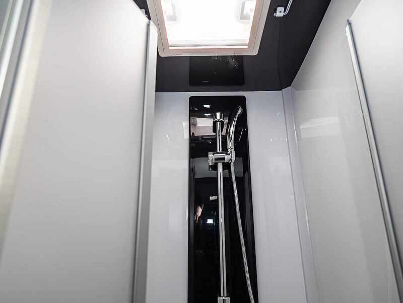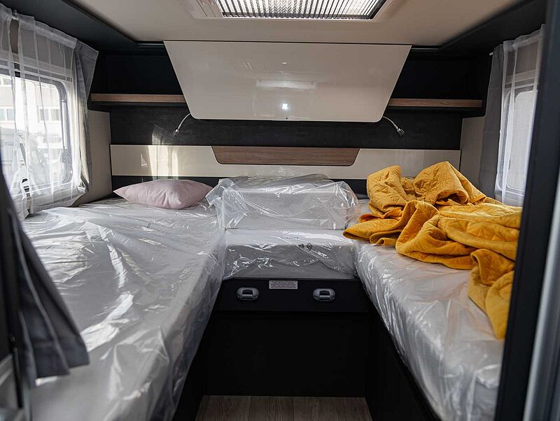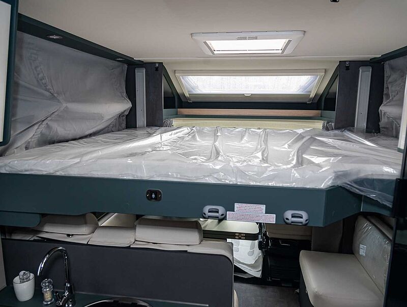 - Komfort Paket Kosmo L (Duscheinlage aus Holz, Dunstabzugshaube, Isolierter Abwassertank, Beheizter Abwassertank, T-Haube mit Skyview zum Öffnen, Schlafzimmerwände in Eco-Leder verkleidet, Ausziehkörbe und -schränke in der Küche, Premium XL-Aufbautür mit Fernbedienung, Zentralverriegelung, Fenster Verdunkelung, Ablagefach und Gasdruckstoßdämpfer, Vorbereitung Rückfahrkamera, Auf den Wohnraum abgestimmte Sitzbezüge)